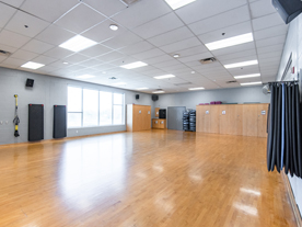 Frank McKechnie Activity Studio has a wood sprung floor and mirrored walls for group exercise classes like yoga, fitness boot camp, tai chi, and more.