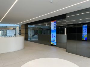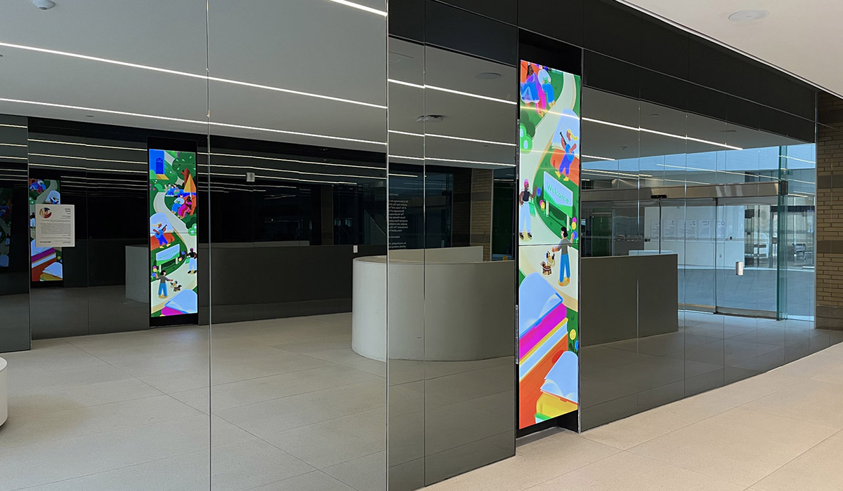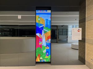 Familiar characters on screen greet library visitors, welcoming them to experience and explore the grandness of Hazel McCallion Central Library. The artwork also depicts the new public artwork, Lightfall, by Nathan Whitford.