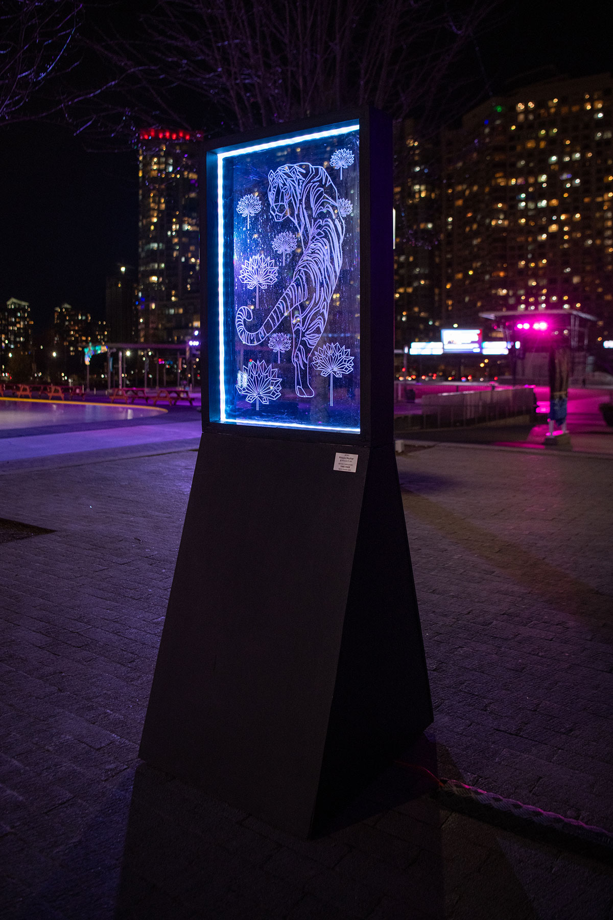 The tiger is undoubtedly one of the most beautiful creatures in the world, inspiring awe it is no wonder that it is a symbol of beauty, strength, resilience and power in many traditions and cultures. Tigers inhabit both the lands of ice and the lands of light and this is why I felt the tiger to be the perfect muse for this installation. The light installation tells the story of the tiger’s beauty, surrounded by lotus flowers it is also a metaphor for its resilience-lotus flowers grow and bloom in very murky conditions but also endure intense sunlight and high temperatures.