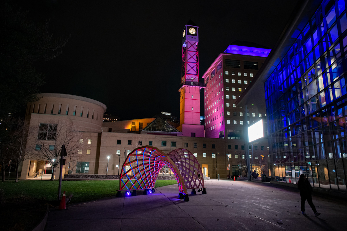 In a time of global supply chain issues and in an industry where efficiency and productivity are paramount, reciprocal frame structures provide the opportunity to achieve more with less. Material consumption can be reduced, accuracy can be increased, and costs can be reduced. Reciprocal frame structures facilitate faster assembly times, thereby reducing labour costs. This installation is the first robotically fabricated, doubly curved reciprocal frame structure on the American continent, and of only a handful around the world. Our research aims to create awareness and encourage more building professionals to expand on the work in this domain.