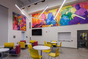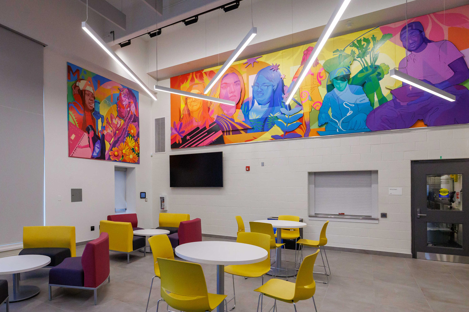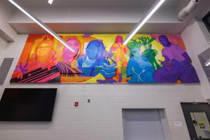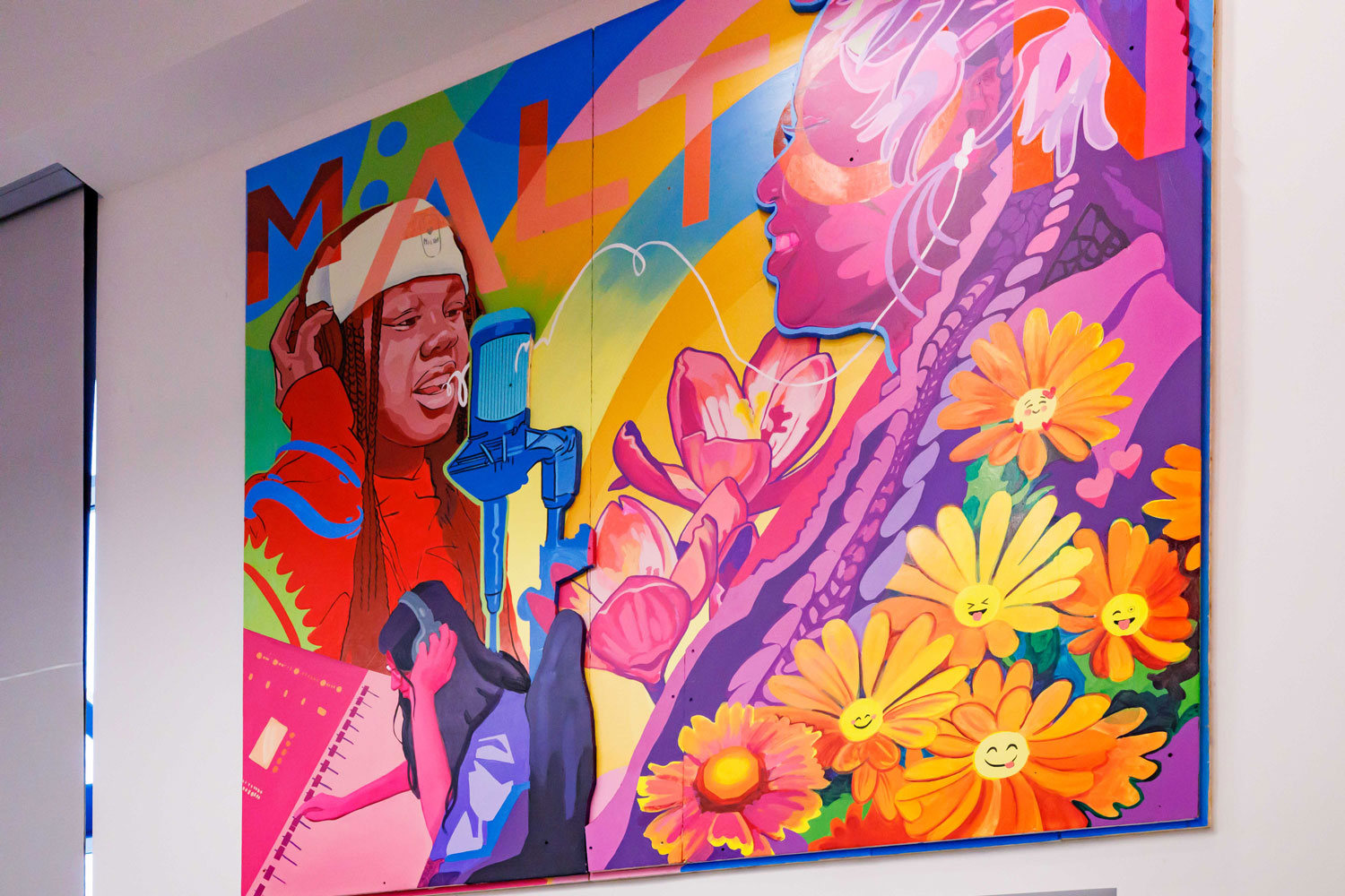 For the smaller artwork, the design focuses on the transformative nature music can have through expression, collaboration and sharing with others. The piece was inspired by the recording studio at the Malton Youth Hub. Many youth will use this space to create their own unique music which will inevitably inspire others. The Hub will be a center of safety, community, creativity and play for many youth and I wanted this piece to represent this.” – Curtia Wright