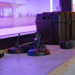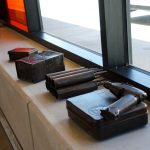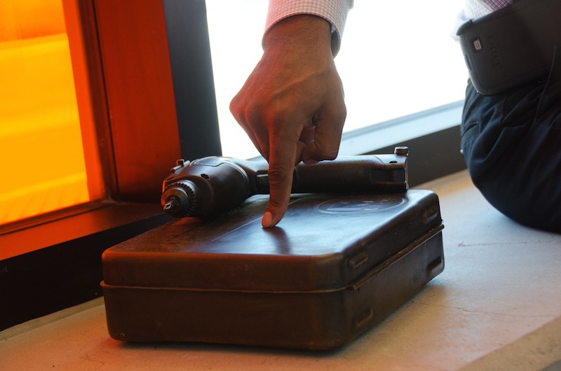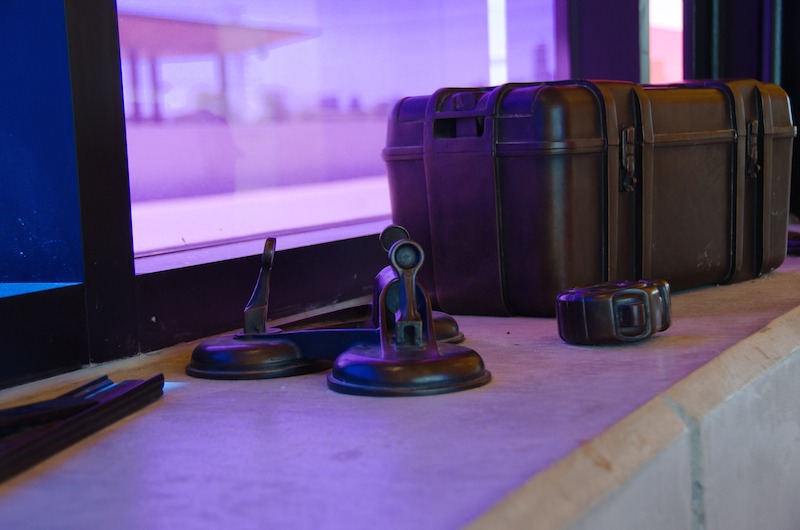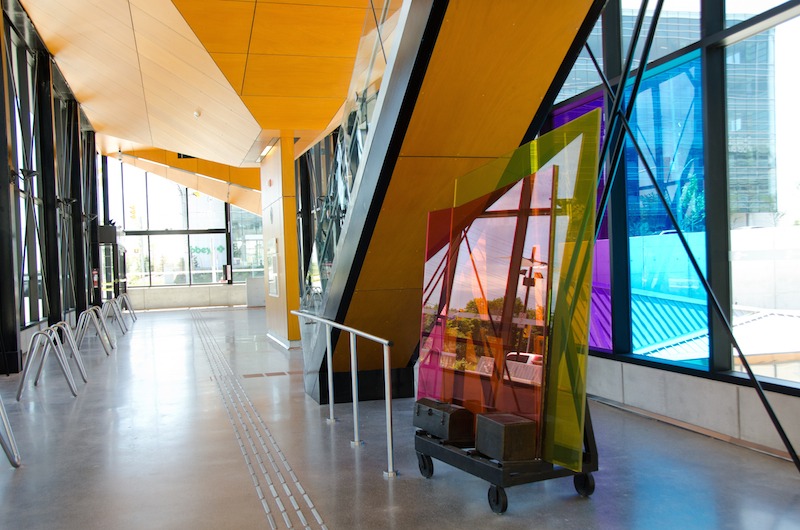 Throughout the stations, various tools and equipment for glass installation are scattered, simulating a work site momentarily unoccupied by its workers. The public is to envision witnessing a change taking place as the predominantly clear glass of the stations is being replaced with coloured glass.