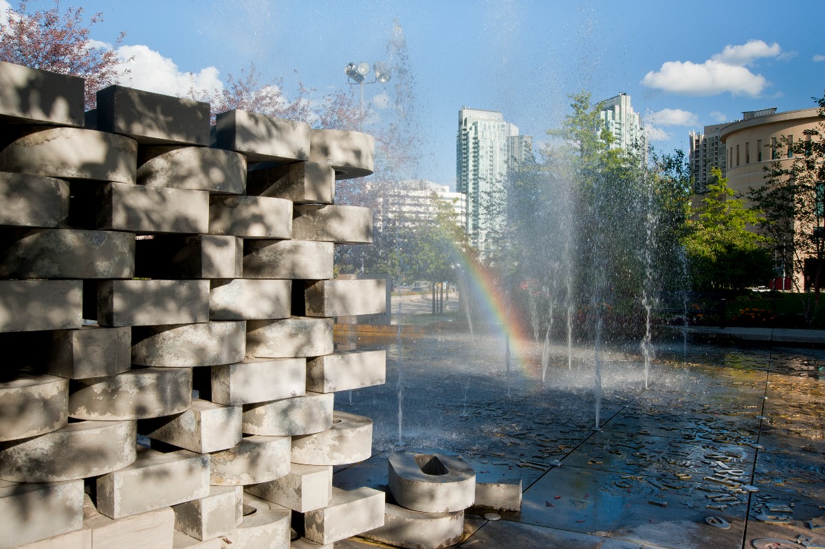 Pool of Knowledge is a square water fountain, featuring flooring made of panels that incorporate letters of the alphabet. In 1997, when the artwork was created, the internet was known as the “information superhighway”. The work symbolizes letters being transformed into digital code, suggesting the coming information age but also indicating the overwhelming nature of this information. The artwork asks its viewer to consider how can information be deciphered and how can one navigate this new digital landscape?