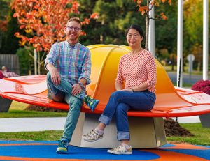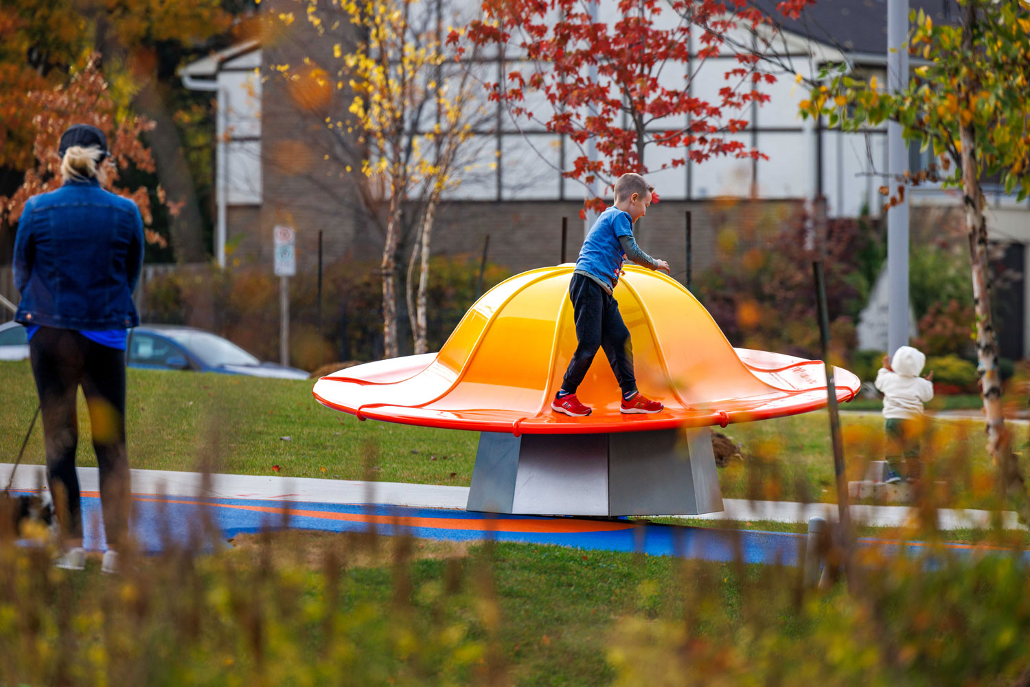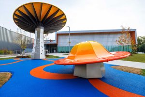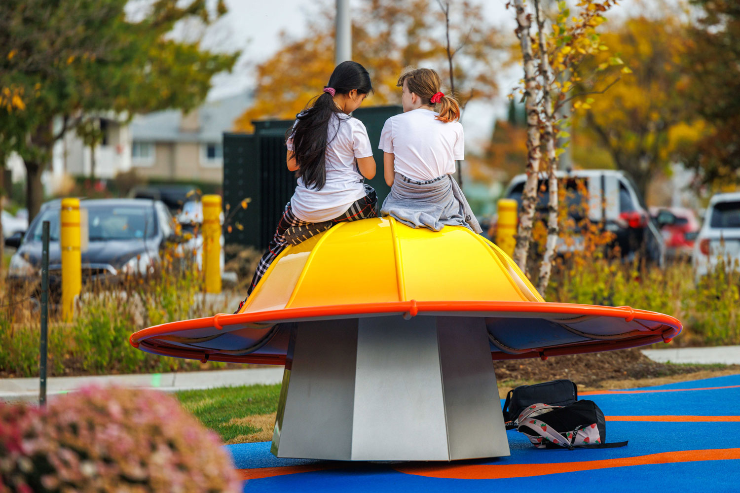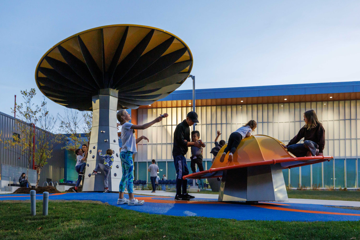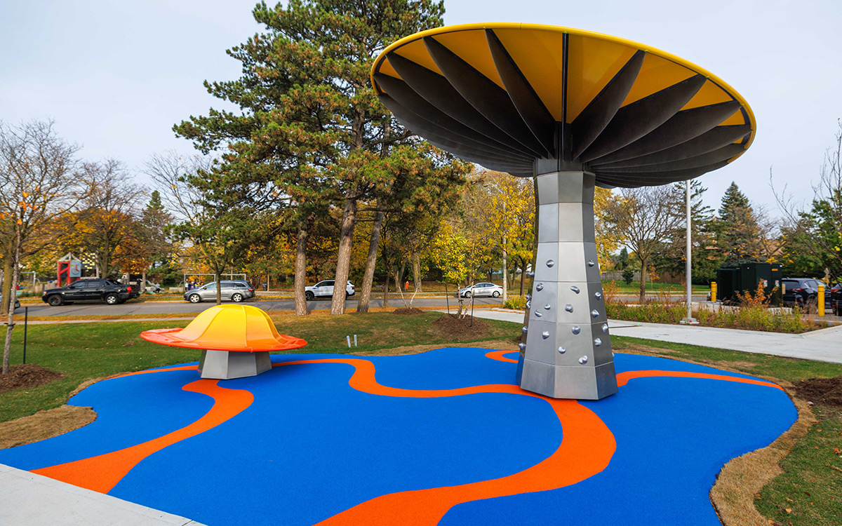 The ground plane is playfully coloured by rubberized surfacing strands referencing the network of mycorrhiza around the bases of the mushrooms. The tall mushroom acts as a canopy to protect visitors from sun, rain, and snow. The top of the shorter mushroom is of an accessible seat height. Its surface gently curves upwards, allowing teens to lean back and look at the sky, for wheelchair visitors to nest beside, and for children to scamper upwards, and then rise to a rounded top for perching – a place to see and be seen.