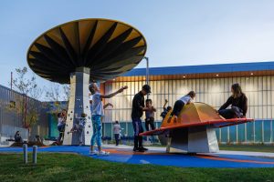 The cluster of sculptural mushrooms is connected to the diagonal path of the Community Centre’s open space via a universally accessible rubberized surface.