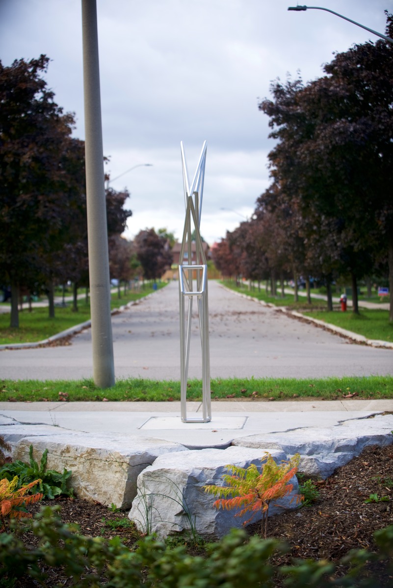 Gala Procession is a companion artwork to Gala Gateway. Both are permanent public art sculptures that trace inspiration from the natural elements of Canada and the dynamism of performing arts. The artworks create tension through their materials: rough and smooth, hard and soft, heavy and light.