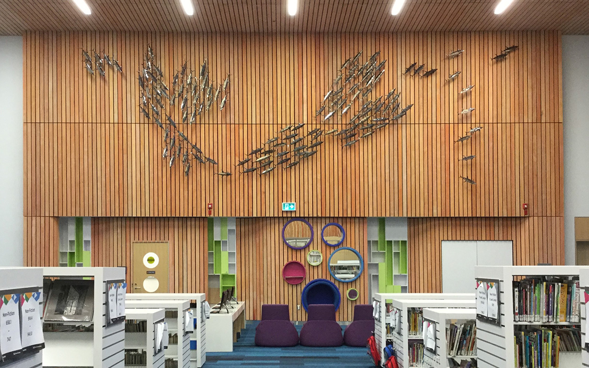 The artwork depicts the fish of Lake Aquitaine, linking the Meadowvale Library building with the landscape around it. By repurposing scrap metal parts into dynamic and lifelike sculptures, the artist captures a pleasing contrast between the natural world and the rigid and cold nature of metal as his medium.