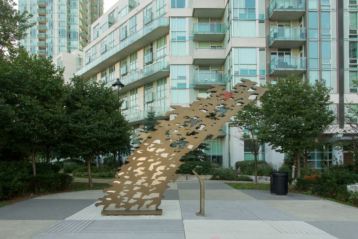 Two sculptures of laser-cut panels of birds are inset with sandcast glass. The artwork recalls the story of the passenger pigeons that used to number in the billions as they flew across the southern coast of Lake Ontario during their migrations and would roost on the southern edge of Mississauga.