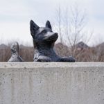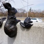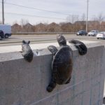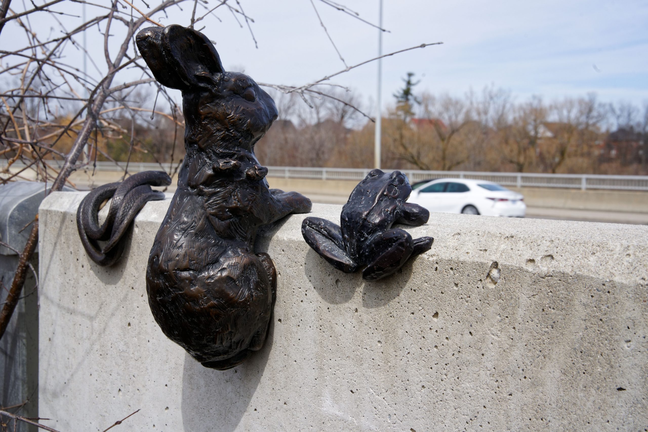 Each of the four corners of the Mavis Bridge holds a secret. Groups of bronze sculptural ravine animals have been placed on the backsides of the walls, peeking into the “human world.” These are interpretations of fauna that are known to currently inhabit Fletcher’s Creek: an eastern painted turtle, a pileated woodpecker, an eastern garter snake, a coyote pup, a white-footed mouse, a green frog, a spotted salamander, an eastern cottontail rabbit, a pair of bumblebees, a green darner dragonfly, a monarch butterfly, a juvenile beaver and a long-tailed weasel. Many of these sculptures were inspired by animals the artist personally encountered while exploring the Fletcher’s Creek trail system.