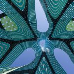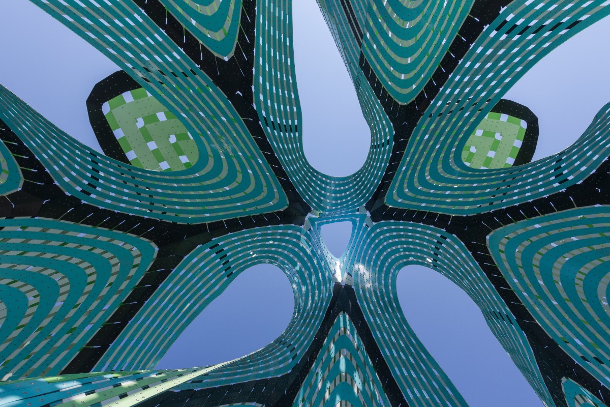 Pine Sanctuary is a large-scale aluminum sculpture that acts as an iconic signal from afar, and offers a dynamic experience of space and light from within.