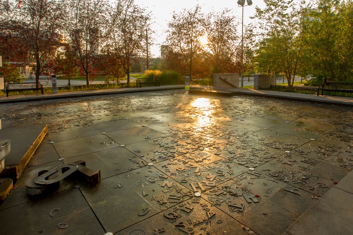 Pool of Knowledge is a square water fountain, featuring flooring made of panels that incorporate letters of the alphabet. In 1997, when the artwork was created, the internet was known as the “information superhighway”. The work symbolizes letters being transformed into digital code, suggesting the coming information age but also indicating the overwhelming nature of this information. The artwork asks its viewer to consider how can information be deciphered and how can one navigate this new digital landscape?
