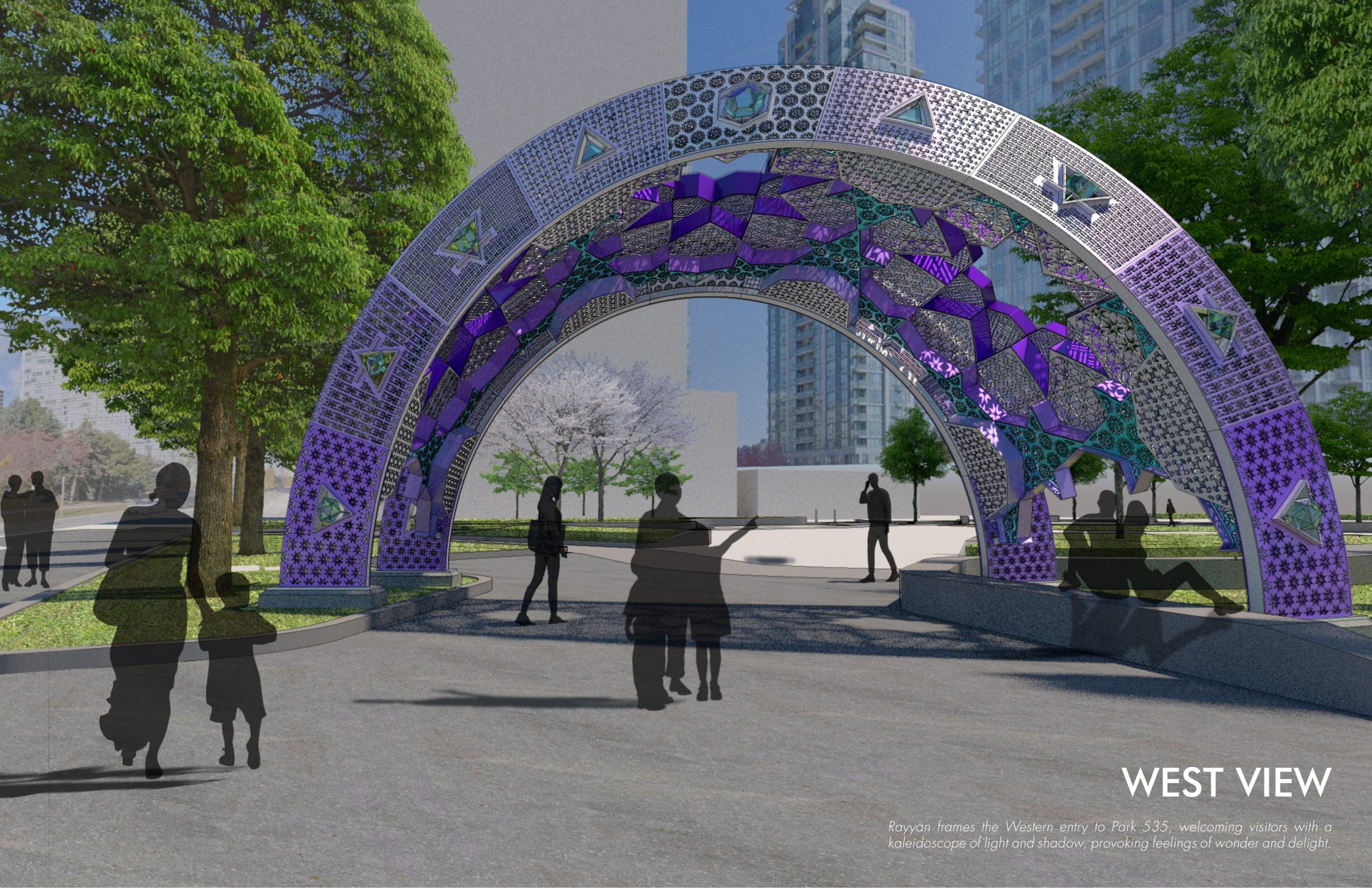 Rayyan: A Cosmic Bloom is a dynamic gateway sculpture that explores the symbolic connections the community can share and exchange with the cosmos through the language of sacred geometry. The art piece offers a cultural exchange through the incorporation of Islamic architectural design elements and Afrofuturistic concepts represented through West African Akan adinkra symbols. Rayyan is a layered public art experience designed for people from all walks of life as it revisits traditional principles of the cosmos through contemporary innovations in technology.