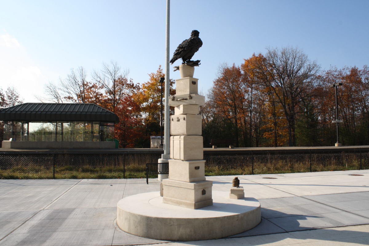 Waves of arriving settlers and migrants inspired the use of luggage pieces from different origins and time periods as symbols in this public artwork. The eagle, modelled in wax and cast in bronze, is the symbol of the Mississaugas of the Credit First Nation. The eagle is viewed as the messenger – the mediator between two worlds, the one of the Creator and the one of the people.