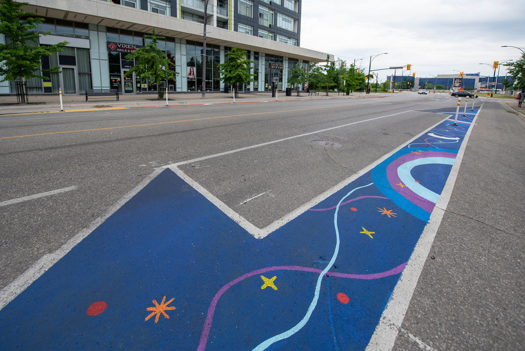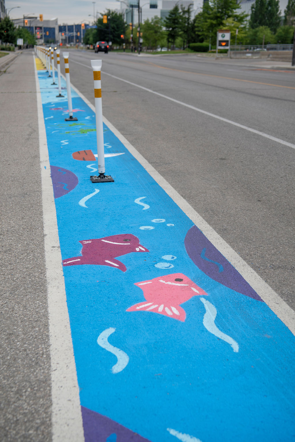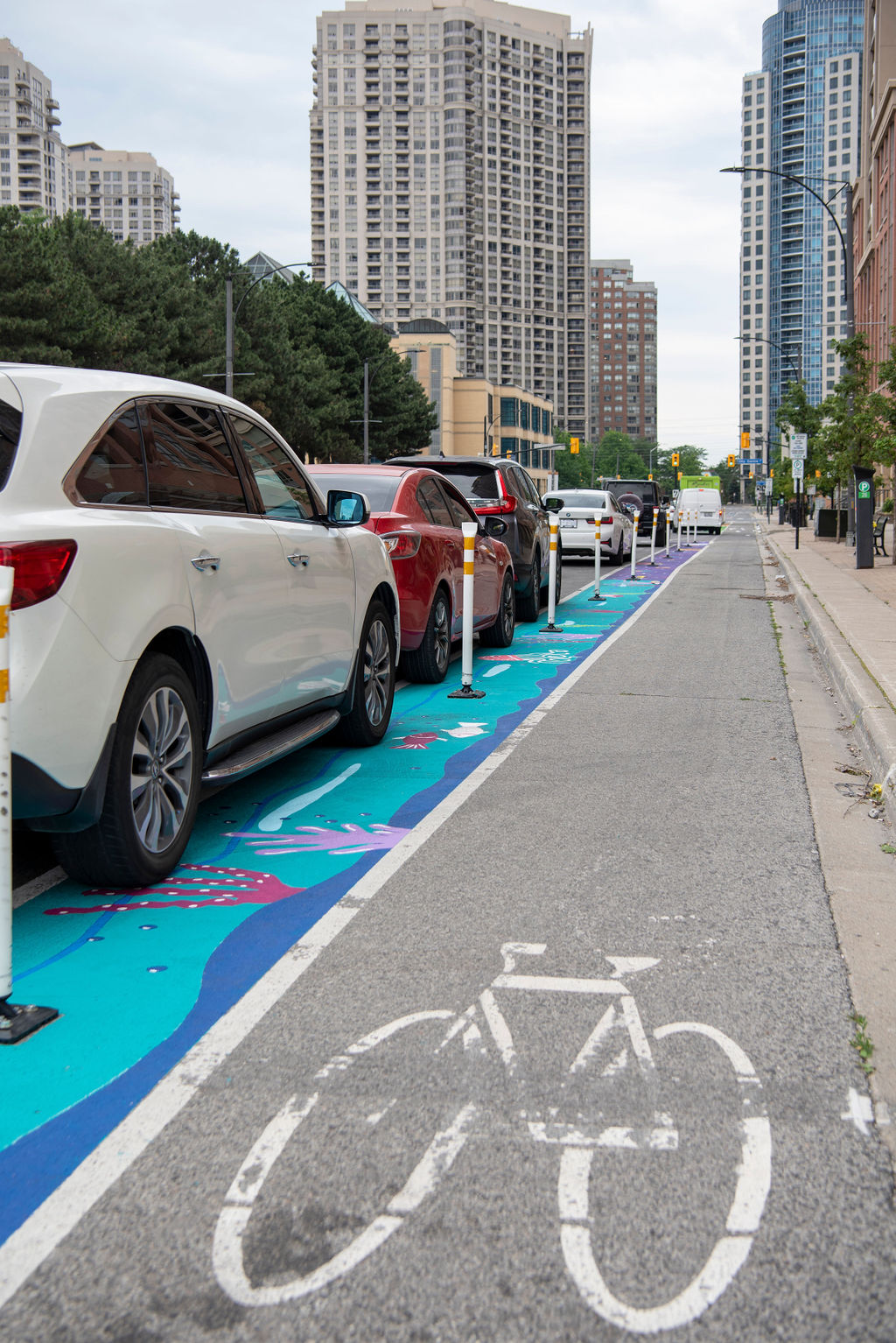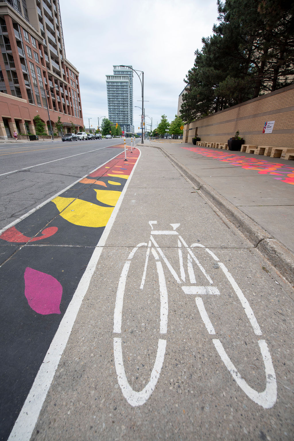 Interconnection is a new temporary public artwork by Moonlight Murals Collective, integrated with the protected, on-road bike lanes on Living Arts Drive. These ground murals are located in the buffer zones that run alongside the cycling and parking/road lanes, helping to build a safe, connected, convenient and comfortable cycling network in Mississauga.