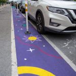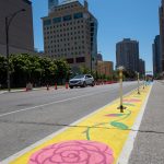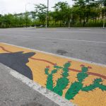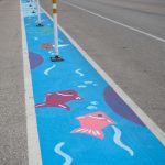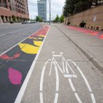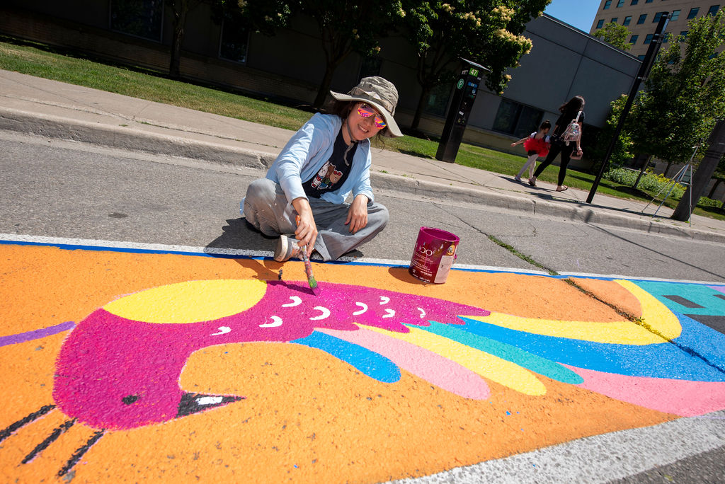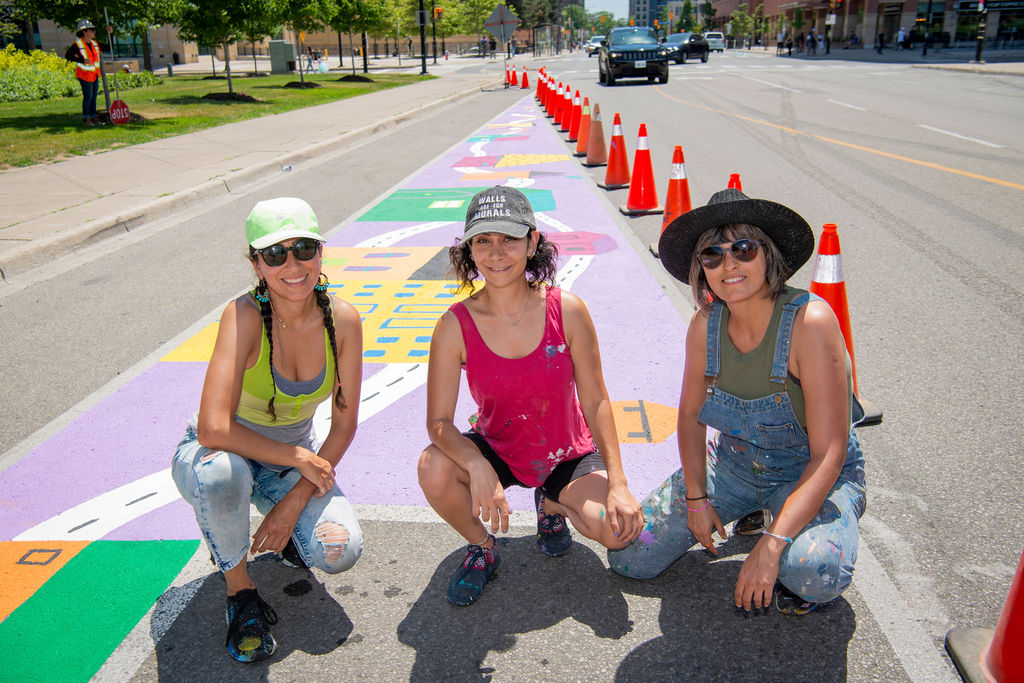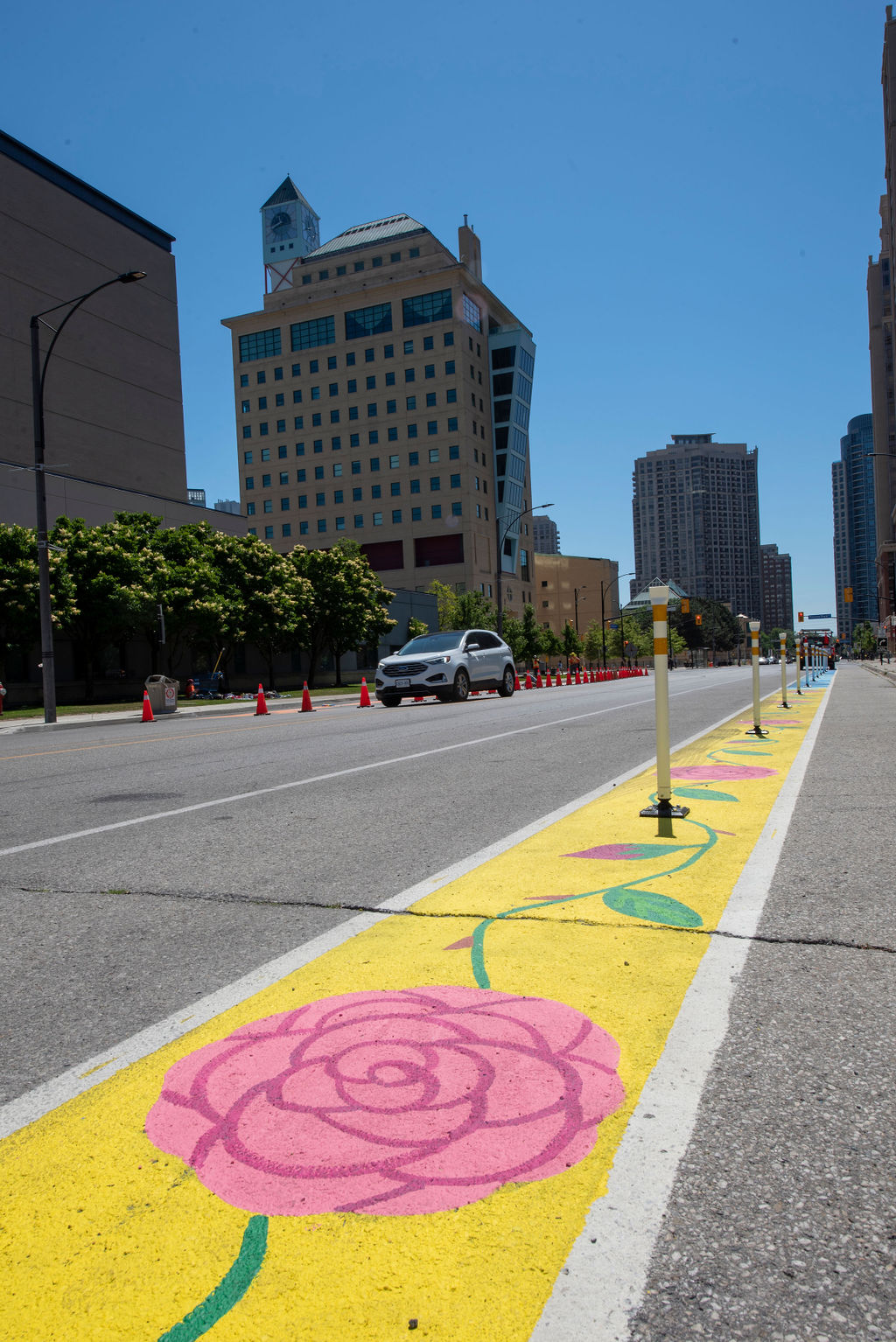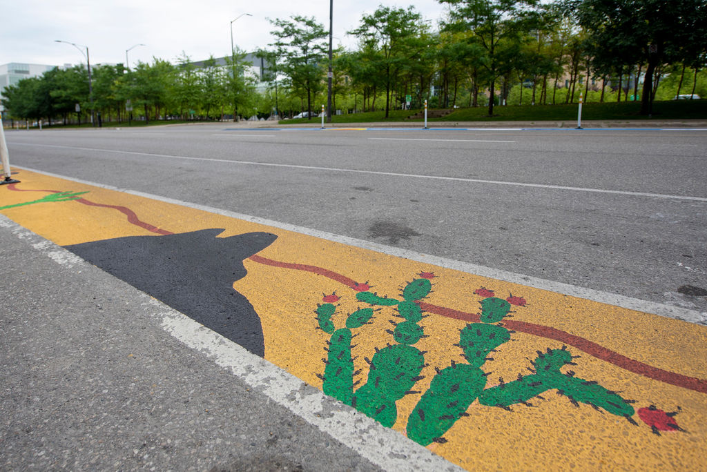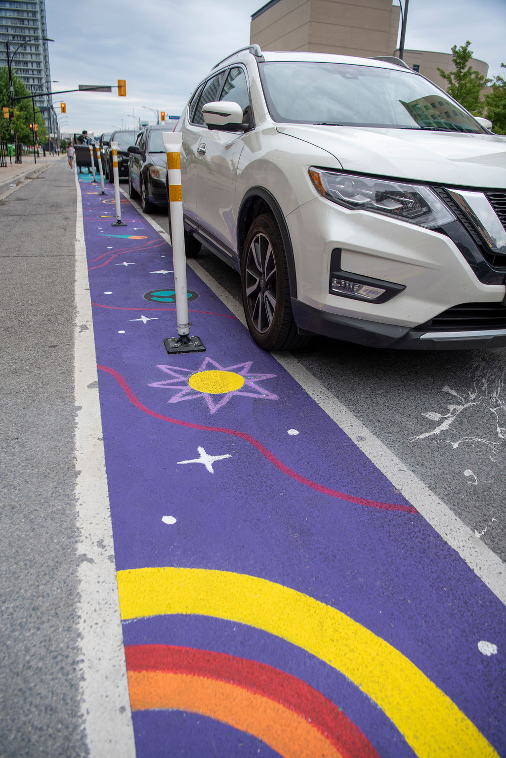 Interconnection is a new temporary public artwork by Moonlight Murals Collective, integrated with the protected, on-road bike lanes on Living Arts Drive. These ground murals are located in the buffer zones that run alongside the cycling and parking/road lanes, helping to build a safe, connected, convenient and comfortable cycling network in Mississauga.