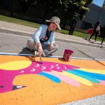 “Our aim in these ground paintings was not only to create a visually pleasing piece of art, but also to tell the story of people in a growing town such as Mississauga and how interconnected we are, not only to each other but also to nature and the land we reside on. Each thematic panel seamlessly connects to the next and at times, appear as opposing forces that make a complete whole reminiscent of the concept of Yin and Yang. Our designs focus on the relationship between humans and the natural environment and inspire the viewers to discover their imagination, emotion, interaction and relationship with their surroundings.” – Moonlight Murals Collective