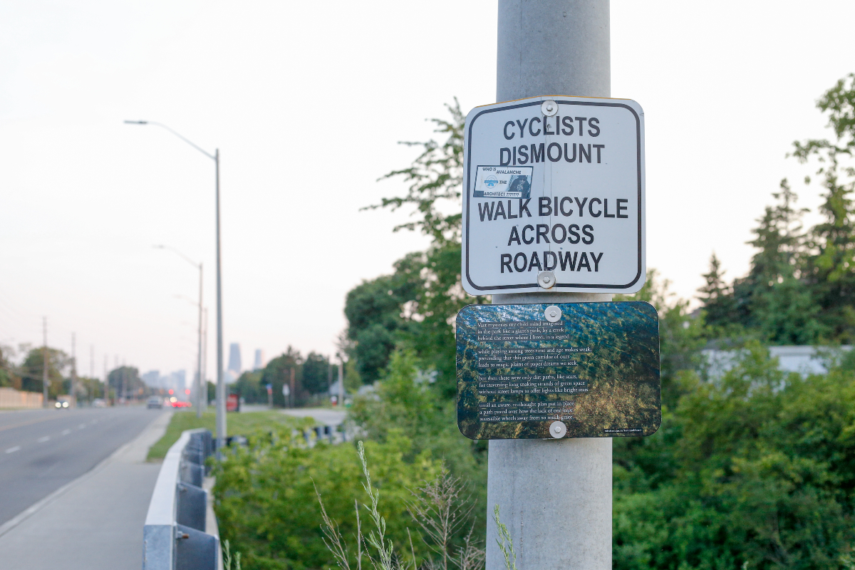 Poetry Lane is a temporary art installation created by artist Hiba Abdallah and Mississauga poet laureate Paul Edward Costa. Located along 4 km of the Burnhamthorpe Trail between Dixie Drive and Absolute Avenue, the artwork consists of 10 aluminum signs, each containing a poem and design that reflects the surrounding environment and community.