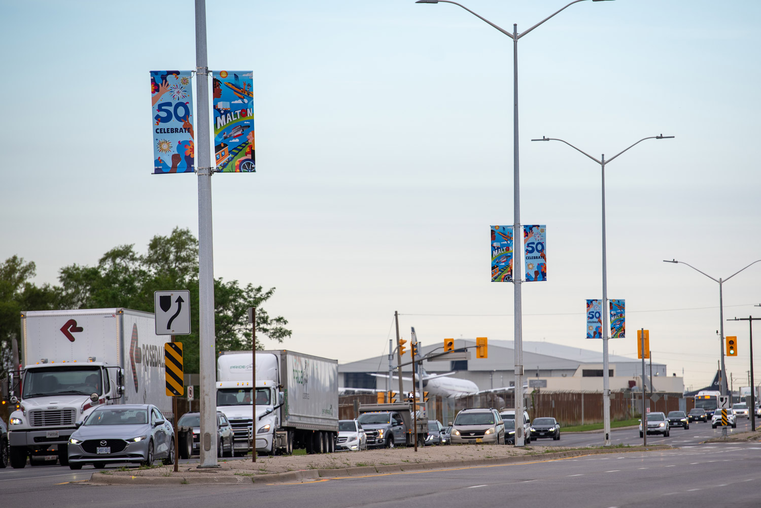 You can see this banner on Airport Rd and Derry Rd within Malton and in the city’s Downtown Core.
