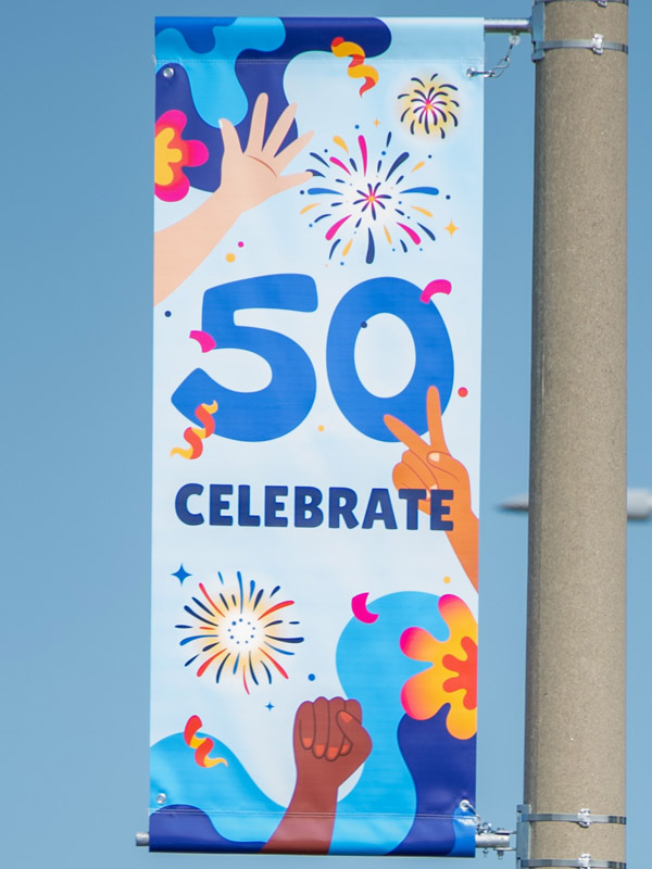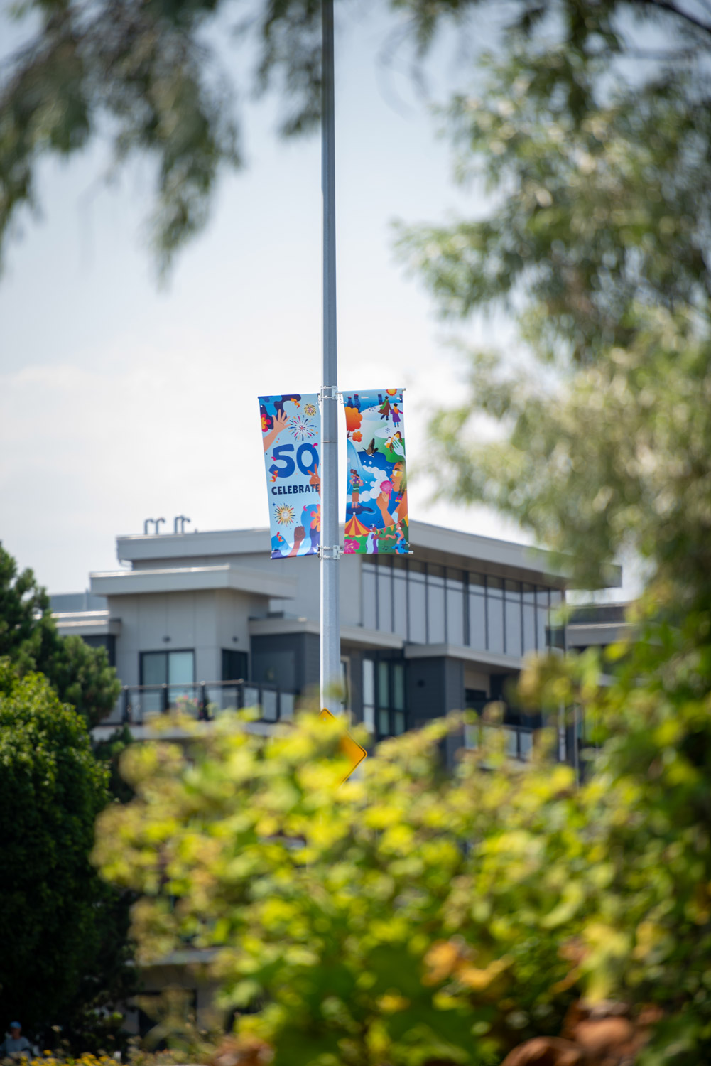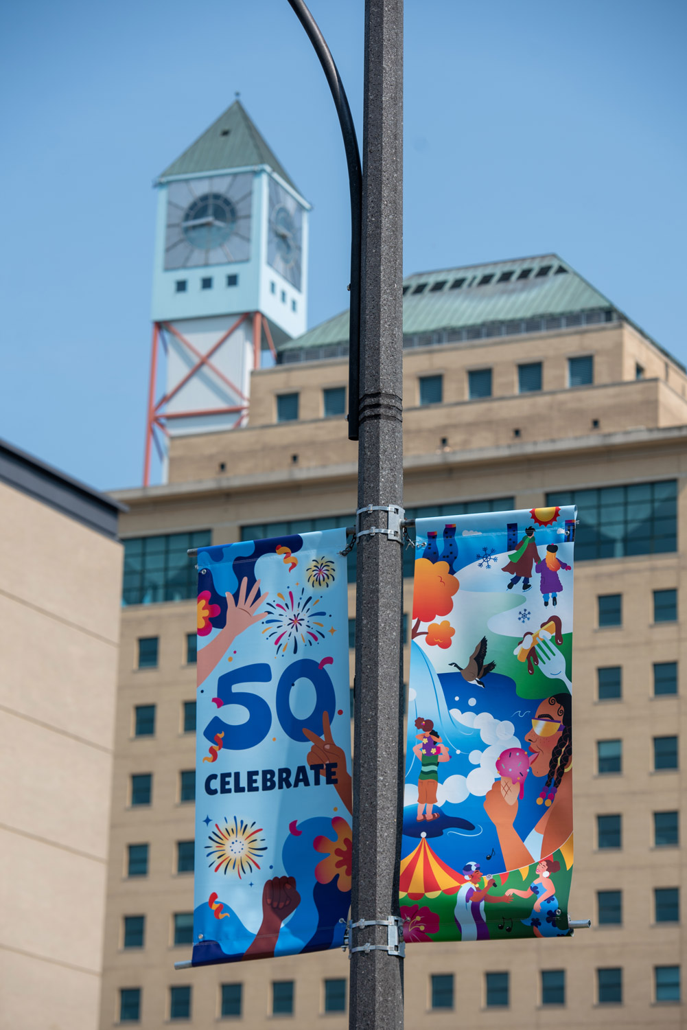 Bringing together all the neighbourhood-specific banners, this banner is a call to celebrate and honour Mississauga’s 50th anniversary.