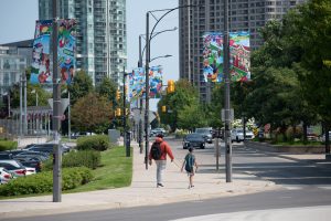 “The City in Colour is a celebratory series of vibrant and cheerful banners bringing the diversity, nature, people, experience and feeling of Mississauga to life. In honour of the city’s 50th anniversary, I wanted to capture the personality and culture of each neighbourhood: what makes them unique and exciting. Through the vibrant colour palette, relatable characters, and familiar landmarks and characteristics, I hope Mississauga and all its people feel represented, celebrated and proud seeing my artwork.” – Alyah Holmes