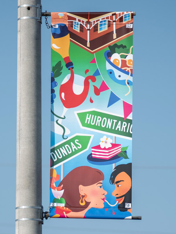 Co-commissioned with Cooksville BIA, this banner features the Four Corners, Taste of Cooksville, the historic Clair House, wine, grapes and a vine (referencing the first winery in Canada, which was located in Cooksville), and Cooksville’s food culture (a couple eating noodles, ramen, shish kabob and the Thai dessert, Khanom Chan).