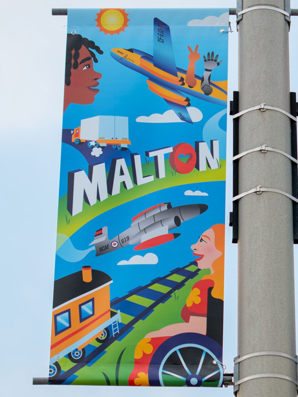 Co-commissioned with Malton BIA, this banner features historic aircraft, the Malton sign, and a train and truck to represent the Grand Trunk Railway, the first railway that came through Malton in 1854 and turned this small community into a shipping centre.