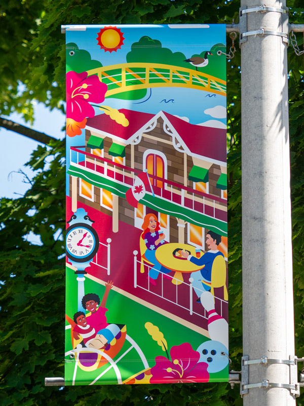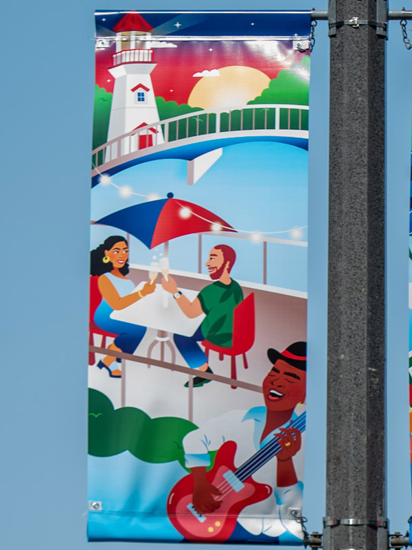 Co-commissioned with Port Credit BIA, this banner features the Port Credit Lighthouse, Credit River, dining and enjoying waterfront patios, Port Credit’s music culture.
