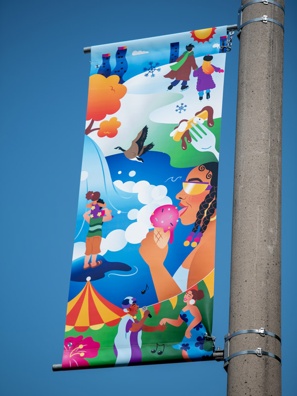 This banner celebrates four seasons in Mississauga and features Mississauga’s skyline, environment and wildlife, skating at Celebration Square, a fork with poutine and ice cream (referencing Mississauga’s summer food trucks), Wahoosh Falls, and a festival tent, banner, live singer and dancer (referencing Mississauga’s live music and festivals).
