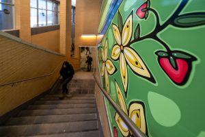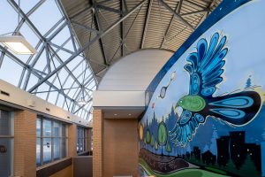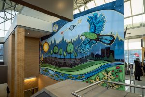 The sun, moon, and stars mark the passage of time, guiding the rhythms of day and season. Birds take flight across the sky, carrying with them teachings of freedom and connection between the earth and the spirit above. The trees stand firmly in the soil, their roots stretching deep below, reminding us of strength and the unseen networks of life that continue beneath the surface, even as the City grows. The river flows steadily, offering sustenance, its waters alive with fish and story. Along the banks, the flowers bloom, carrying both beauty and medicine, showing that healing and life still emerge from the land. Above it all, the skyline rises, a reminder of how the City has grown and continues to change. In the sky, the four sacred colours (yellow, red, black and white) stretch across the sky representing balance, the four directions and the teachings that guide Anishinaabe life.