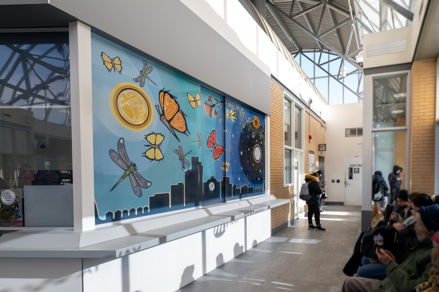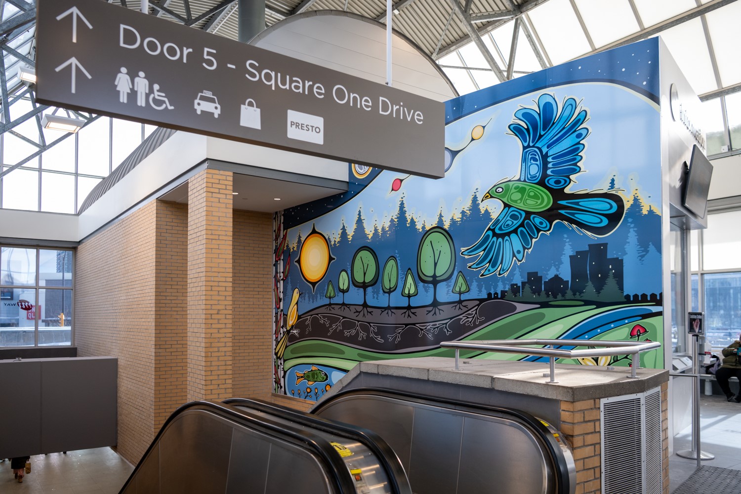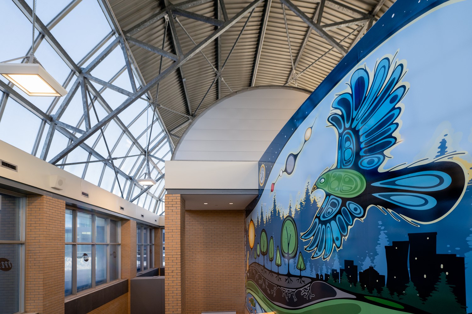 The two murals, The Land Remembers and The Sky Carries Us, are a pair. One rooted in memory of the earth and the other carried by the cycles of the sky. Together, they create a visual journey through the terminal: grounding commuters in the strength of the land while lifting their gaze to the guidance of the sky. These works balance stillness and movement, past and future, reminding all who pass through that we walk on lands with long memory and move beneath skies that continue to carry us forward.