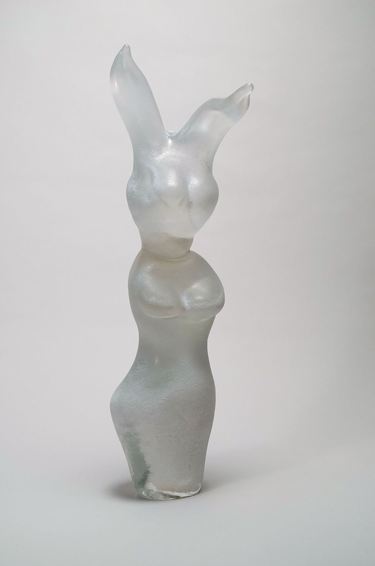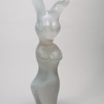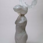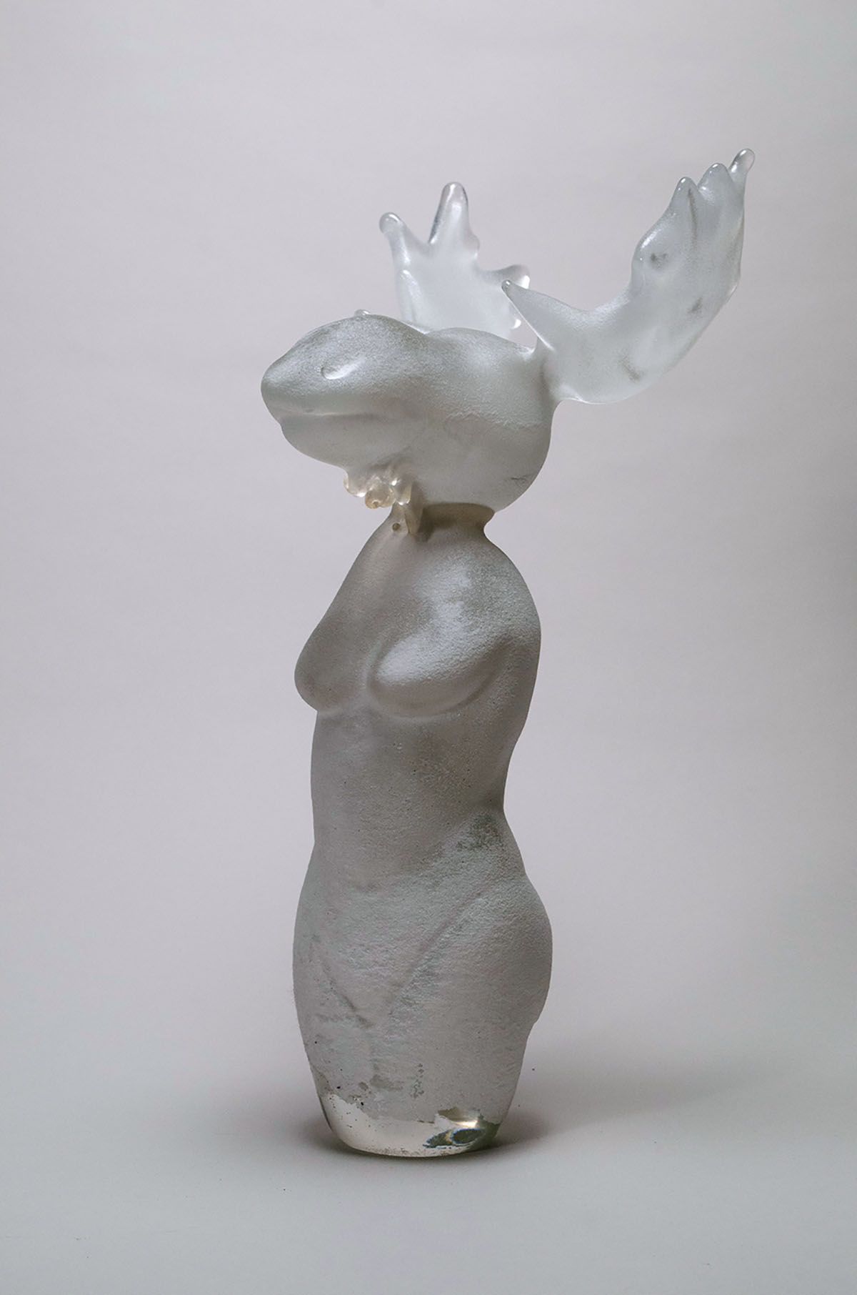 My ‘Androgymals’ series is about my relationship with my own identity as a queer androgynous person. The relationship of the mind and body extends far beyond the pure physicality of living in the world and has drastic impact on how a person can see themselves and others. More recently my work has begun to explore this in my own view of my “otherness” and seeks to visualise it, giving a space and form to the feeling. By taking the classic glass form of the female figure and attaching a visibly male animal head, such as a moose, I create a sculpture that informs a sense of disconnect and strangeness. By forcing this feeling on the viewer I begin a conversation about it and the underlying ideas of identities, bodies, and how we view ourselves.” – Em McDonald