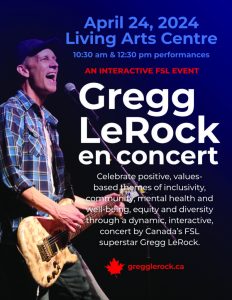 Celebrate themes of inclusivity, community, well-being, equity, and diversity through a dynamic and interactive concert by Gregg LeRock. Two-time Juno award nominee Gregg LeRock is the guitar-slinging, French-singing rocker who makes students want to join in – at the top of their lungs – en francais!