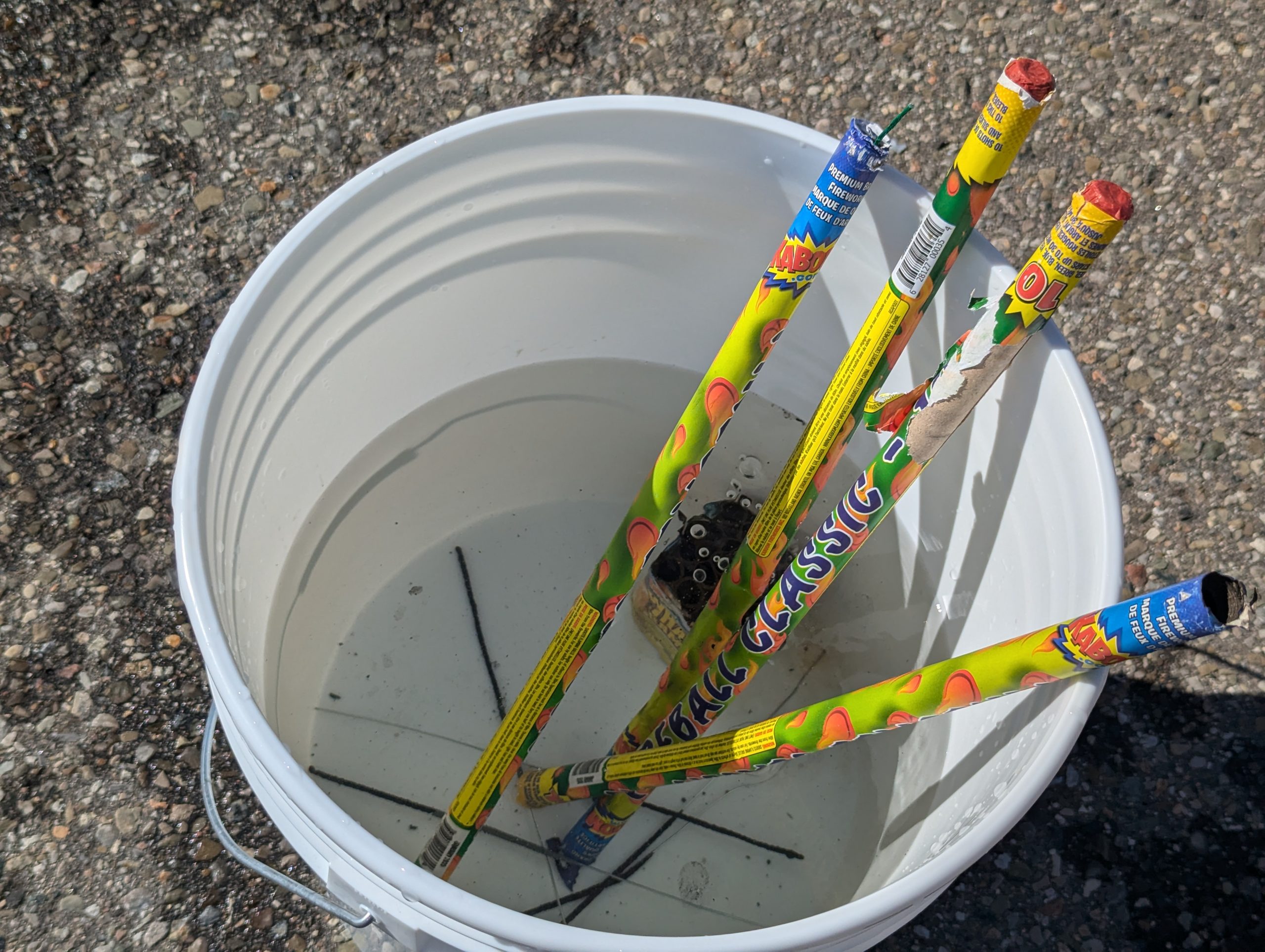 Close up of used fireworks soaking in a water bucket