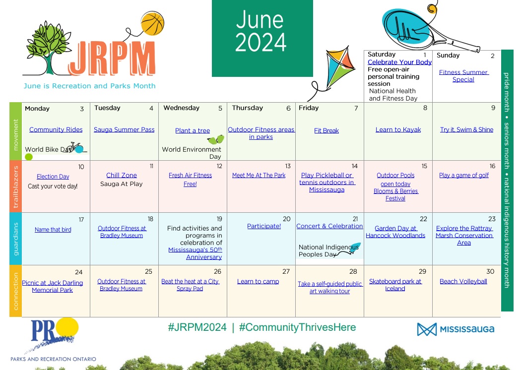 Recreation and Parks Month (JRPM) is celebrated every June and the City of Mississauga is encouraging residents of all ages to adopt a more active and healthier lifestyle. This year’s theme, Community Thrives Here, is a reminder that by visiting parks and engaging in recreational activities, you can improve your quality of life and build stronger connections within your communities.