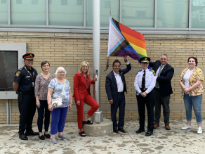 Mayor Crombie and Councillor Dasko joined by Fire Chief Deryn Rizzi, Peel Regional Police Deputy Chief Mark Dapat, Kerry Pond Chief Human Resources Office and Vice-President of People Services at Trillium Health Partners, Carolyn Bieck and Wendie Hutchinson co-founders of Pflag Peel and Julia Bertola, Vice-President of the Sheridan Student Union.