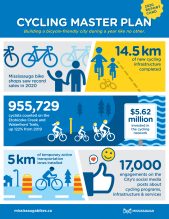 Approved in 2018, the City’s Cycling Master Plan guides the development and operations of cycling infrastructure in Mississauga over the next 25 years. In 2020, the City addressed each of the Cycling Master Plan’s four goals in a variety of ways: