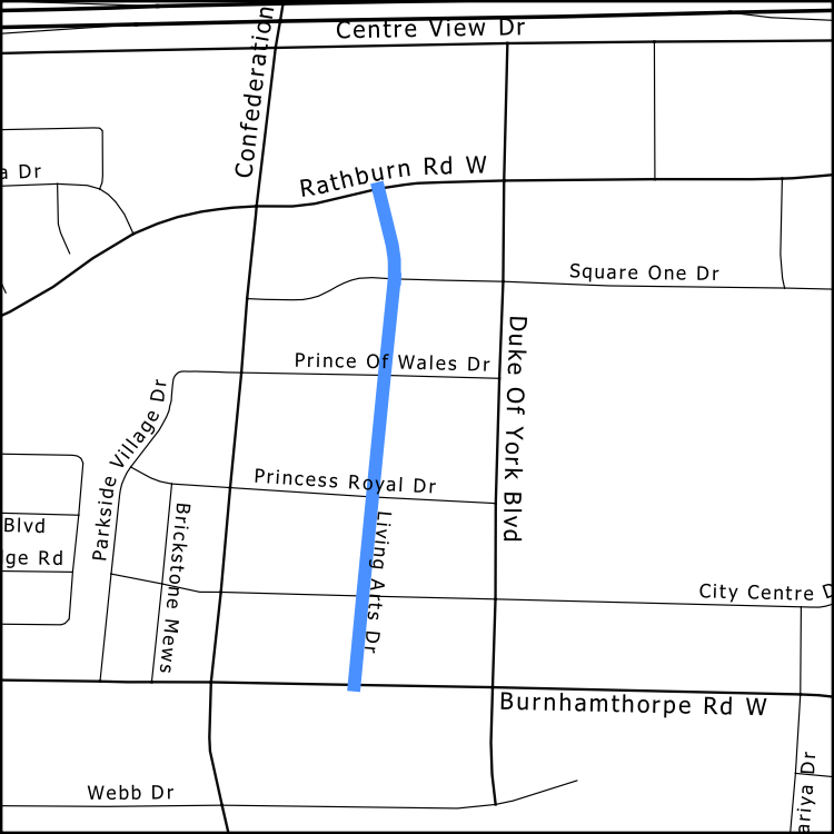 Living Arts Drive between Burnhamthorpe Road West and Rathburn Road West