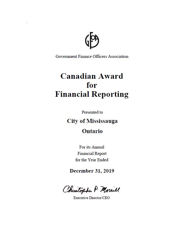 Announced at Budget Committee on April 28, the City of Mississauga’s Finance Division has won an award recognizing excellence in financial reporting – the Canadian Award for Financial Reporting from the Government Finance Officers Association (GFOA) for the 23rd consecutive year for its 2019 Financial Report .