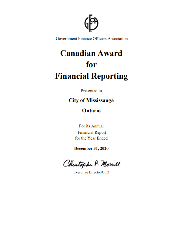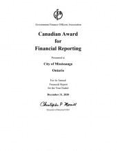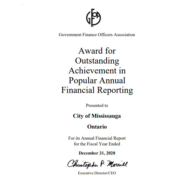 The City of Mississauga has won two financial awards through the Government Finance Officers Association of the United States and Canada (GFOA). This includes the Popular Annual Financial Reporting Award for the 2020 Financial Report Highlights for the fifth year in a row and the Canadian Award for Financial Reporting for the 2020 Financial & Sustainability Report for the 24th consecutive year. Mississauga continues to be the longest-running municipality in Ontario to achieve this honour.