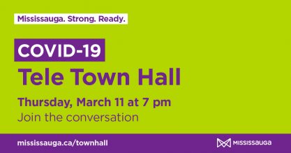 Join a Tele Town Hall on Thursday, March 11, 2021 at 7 p.m. for updates on the Ontario COVID-19 framework how it applies to Mississauga and the plan for community vaccination.