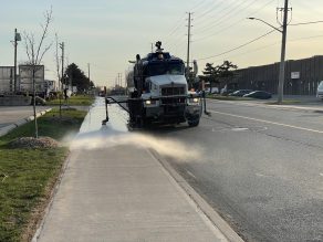 In April, weather permitting, the City begins sweeping streets and flushing hard surfaces to clear litter and debris left behind from the winter, such as on sidewalks, traffic islands, hard-surfaced boulevards, roads and bike lanes. Street sweeping helps prevent pollutants from entering local waterways through Mississauga’s stormwater system. These pollutants can end up in Lake Ontario, Mississauga’s main source of drinking water.