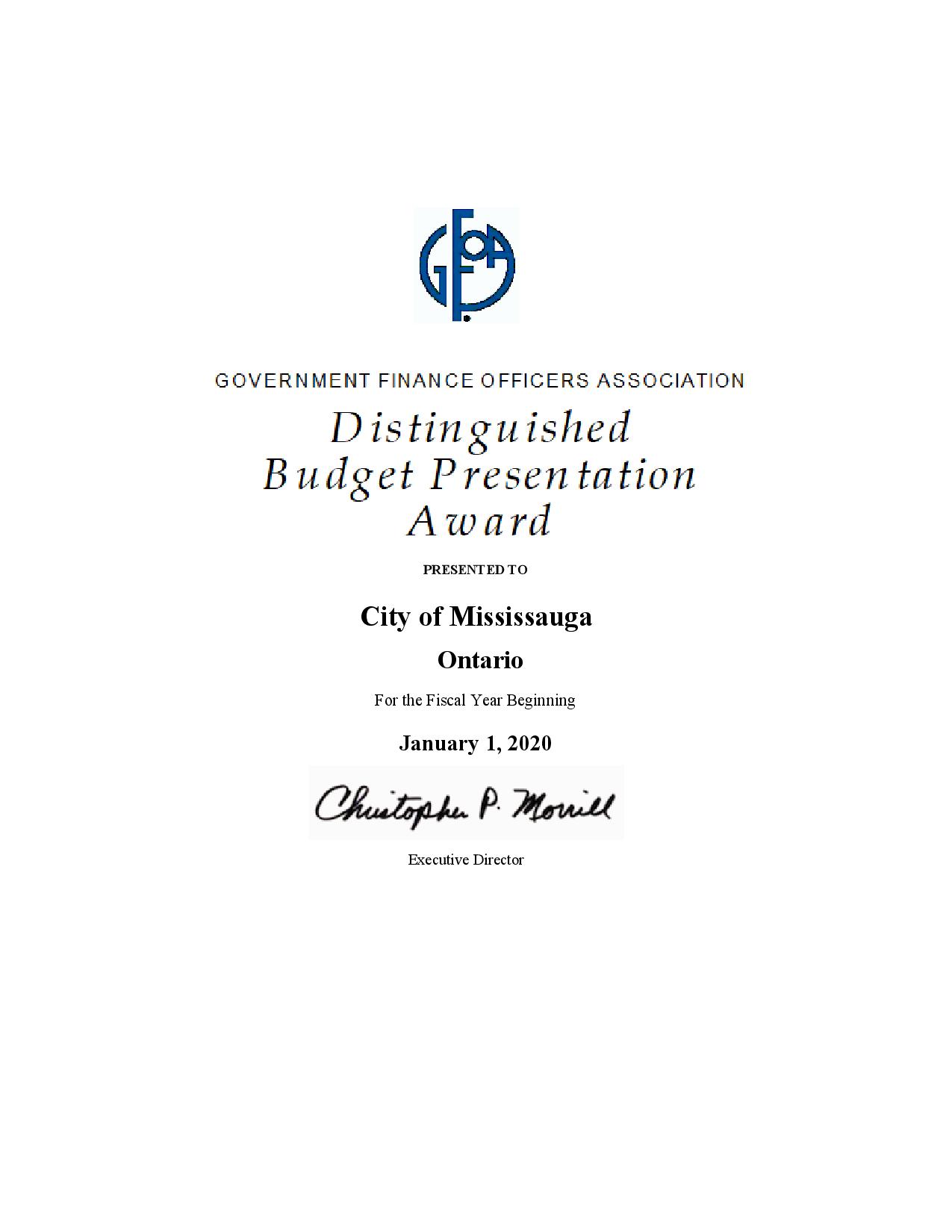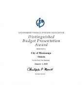 For the 31st consecutive year, the City of Mississauga received the Distinguished Budget Presentation Award for the 2020-2023 Business Plan and 2020 Budget Book – the most by a Canadian municipality. This award was presented by the Government Finance Officers Association (GFOA) of the United States and Canada.
