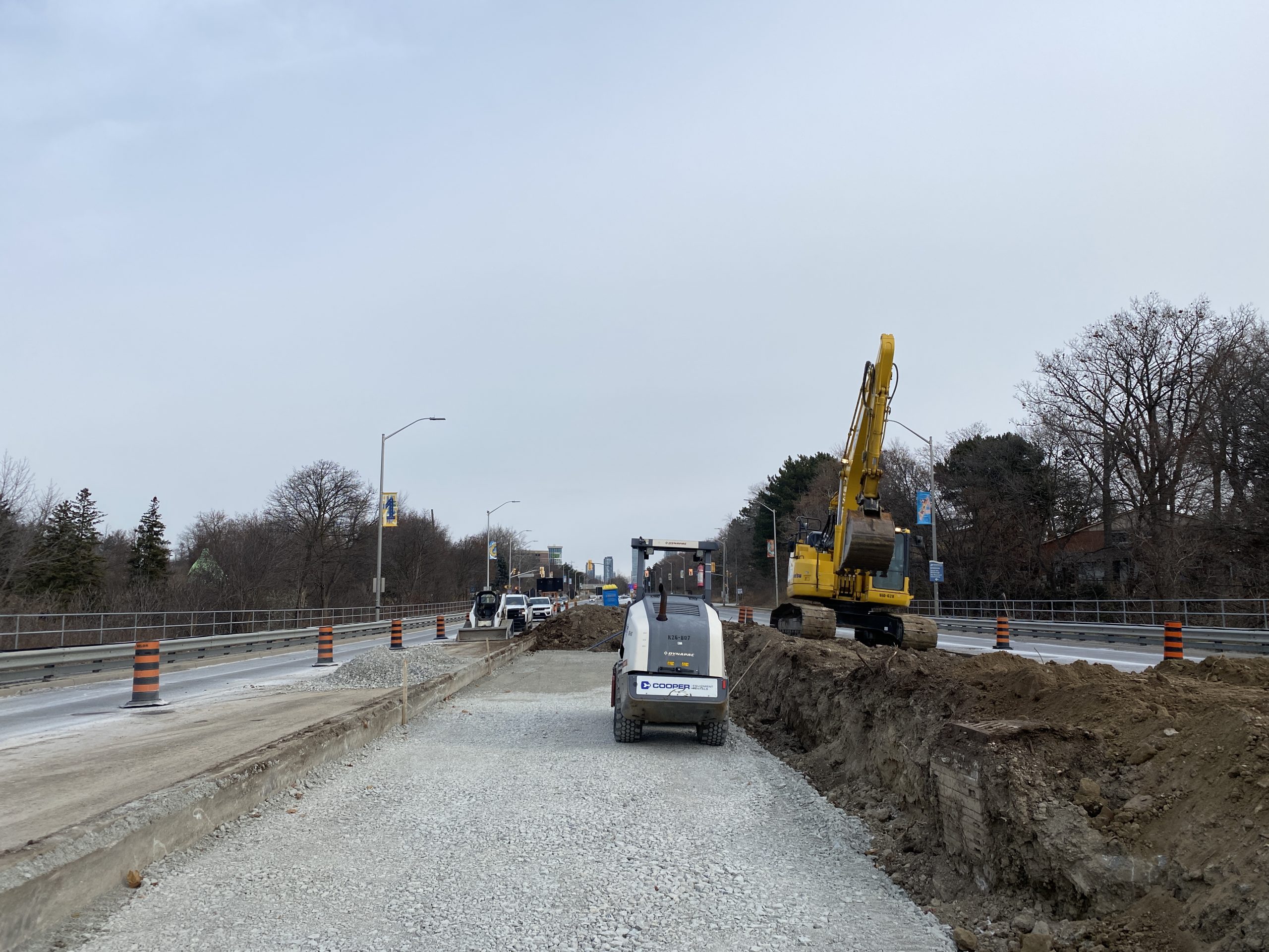 Work continues on the Rathburn Road and Ponytrail Drive Integrated Road Project. Work includes pavement rehabilitation, installation of cycle tracks, new traffic signals and street lights, new pedestrian crossings, noise wall installation, storm drainage and intersection improvements. Work continues into 2024.