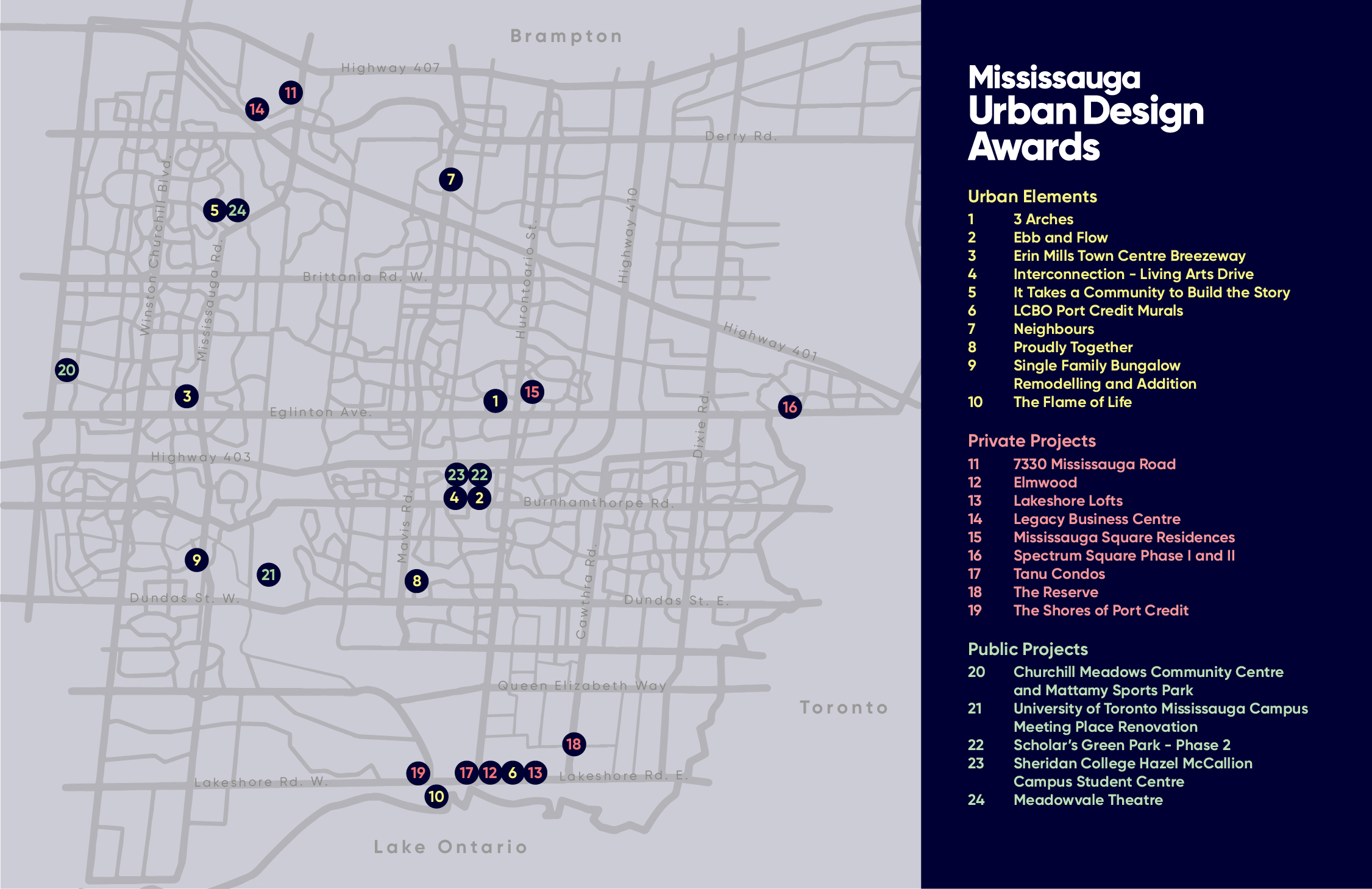 A map of the submissions for the 2023 Mississauga Urban Design Awards