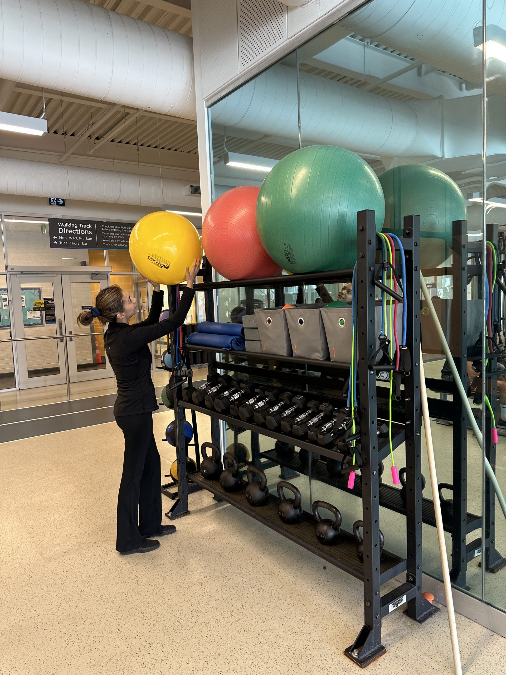 A woman at an indoor gym picking up a workout ball from the rack Water aerobics class in a swimming pool.