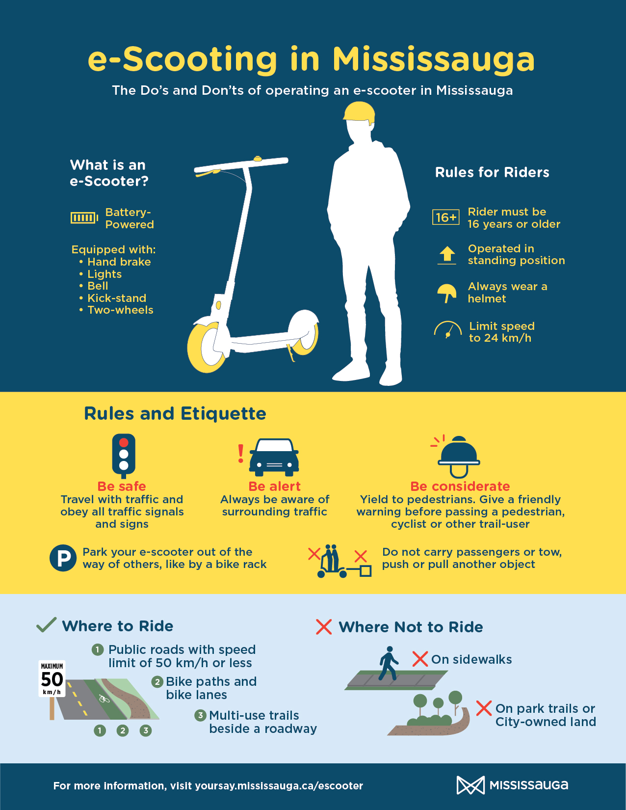 Have thoughts on the use of e-scooters in Mississauga? Visit yoursay.mississauga.ca/escooter to share your experiences operating your e-scooter in Mississauga and interacting with others operating e-scooters in the city.
