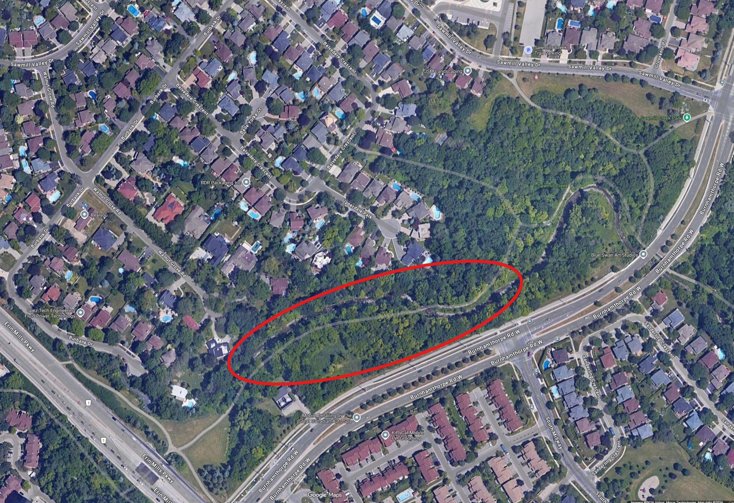 Sawmill Valley Trail (between Erin Mills Pkway and Sawmill Valley Dr, north of Burhampthorpe Rd. W) is closed to the public until further notice.