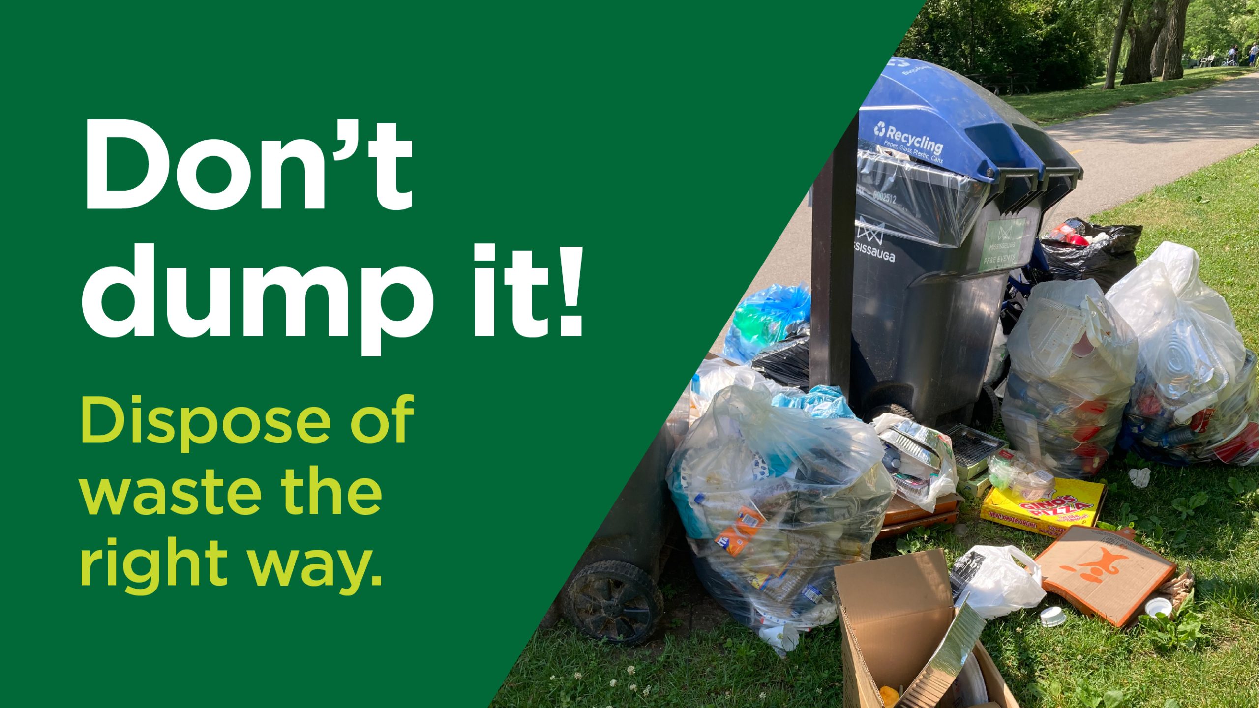 Illegal dumping is when someone drops their unwanted items in public spaces instead of properly disposing of (or recycling) them. Dumping waste on City or private property without permission is illegal. It damages our natural environment, is costly to remove, poses a risk to public safety and is harmful to wildlife and human health.