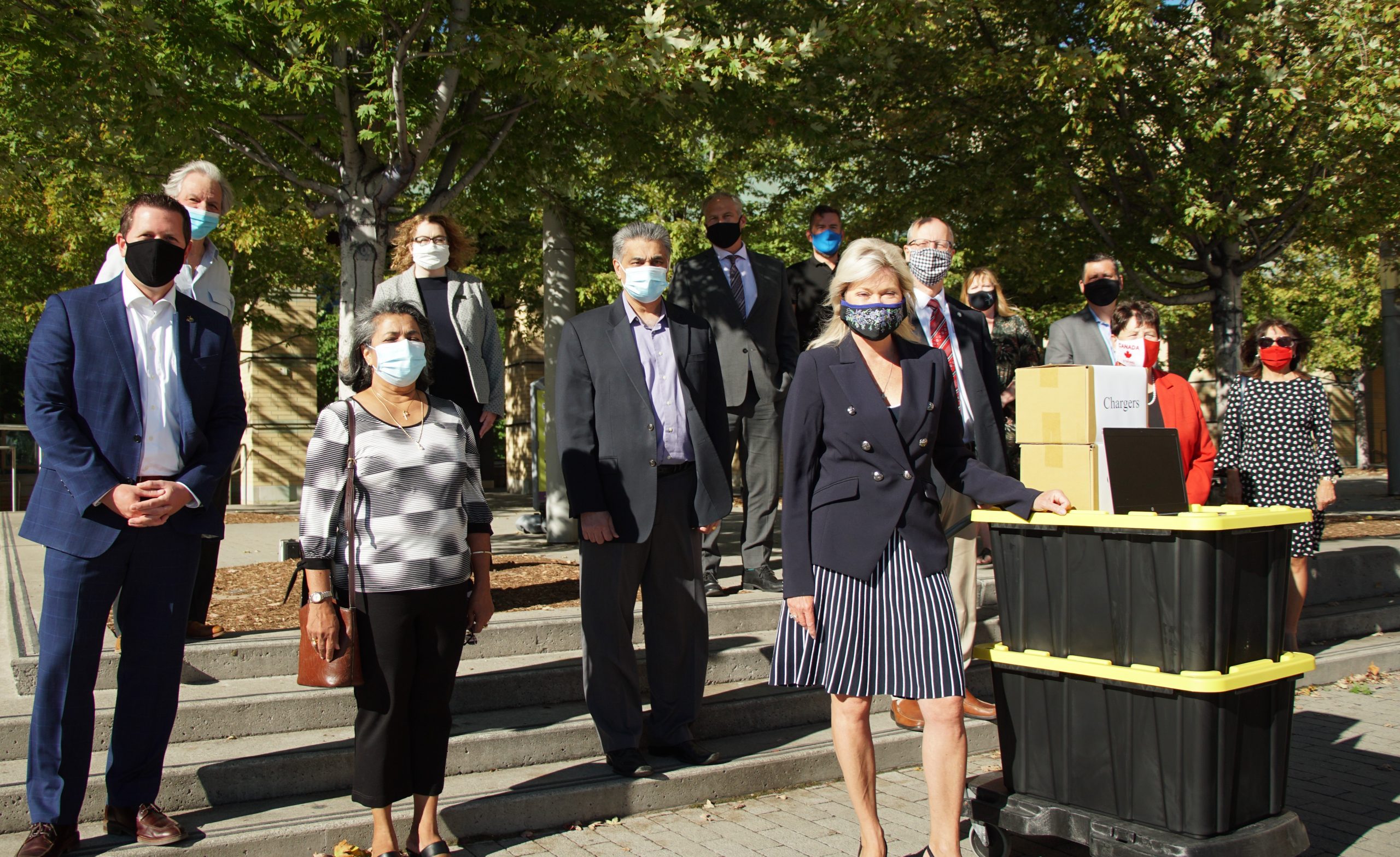 Photo caption: Mayor Bonnie Crombie, Ward 8 Councillor Matt Mahoney and staff are joined by Dufferin-Peel Catholic District School Board and Peel District School Board representatives as the City of Mississauga donates 100 gently-used laptops for distribution to families in need.