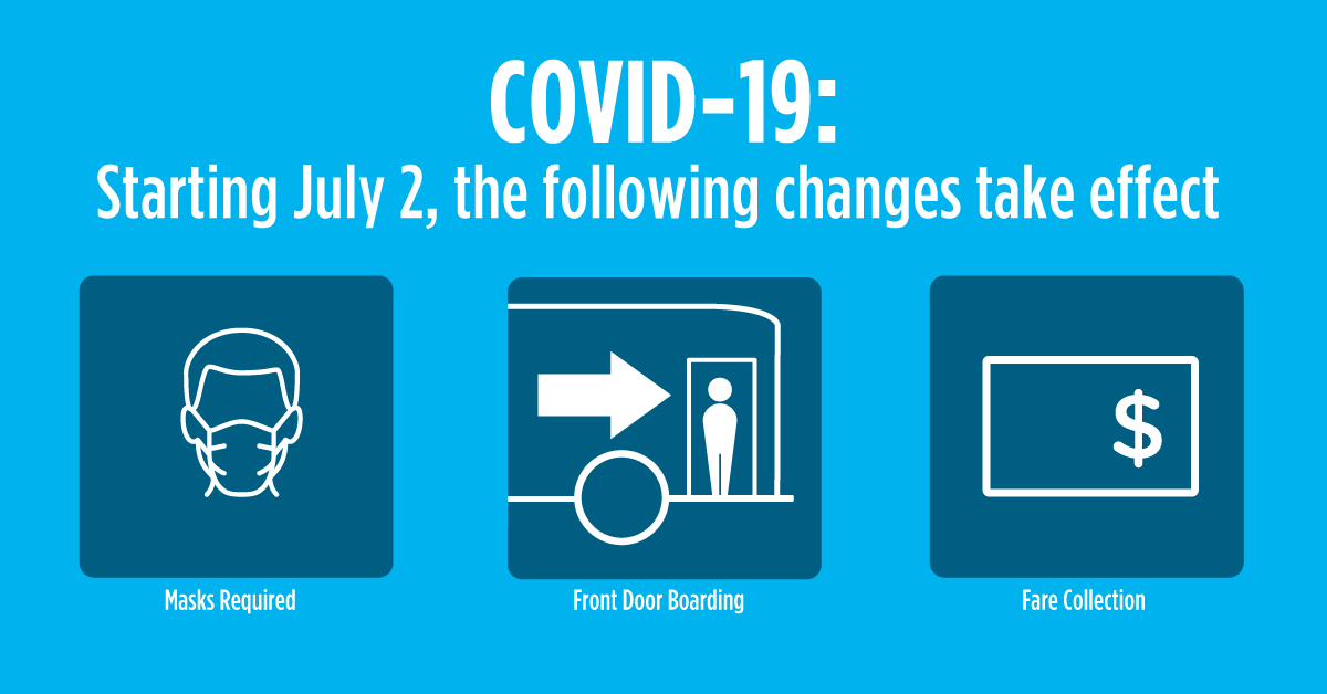 Effective July 2, wearing a non-medical mask or face covering will be mandatory when travelling on MiWay, at stops and transit terminals to reduce the risk of spread of COVID-19. Children under the age of two, people with disabilities or other medical conditions that prevent them from wearing any mask will not be required to wear one. Fare collection and front door boarding for all customers will also resume on July 2.